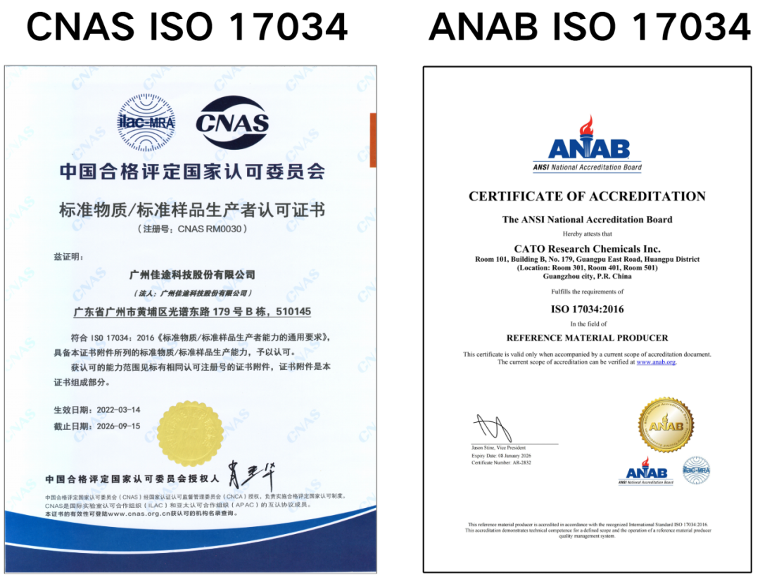 02 质量与体系保障 严苛的质量体系,经得起CDE“溯源” CATO 已通过 CNAS 与 ANAB 的 ISO 17034 标准物质生产者认证,并按照 ISO/IEC 17025 要求运行检测体系。这意味着我们的产品质量、可追溯性与文件完整性,全部经过国际认可的严格验证。