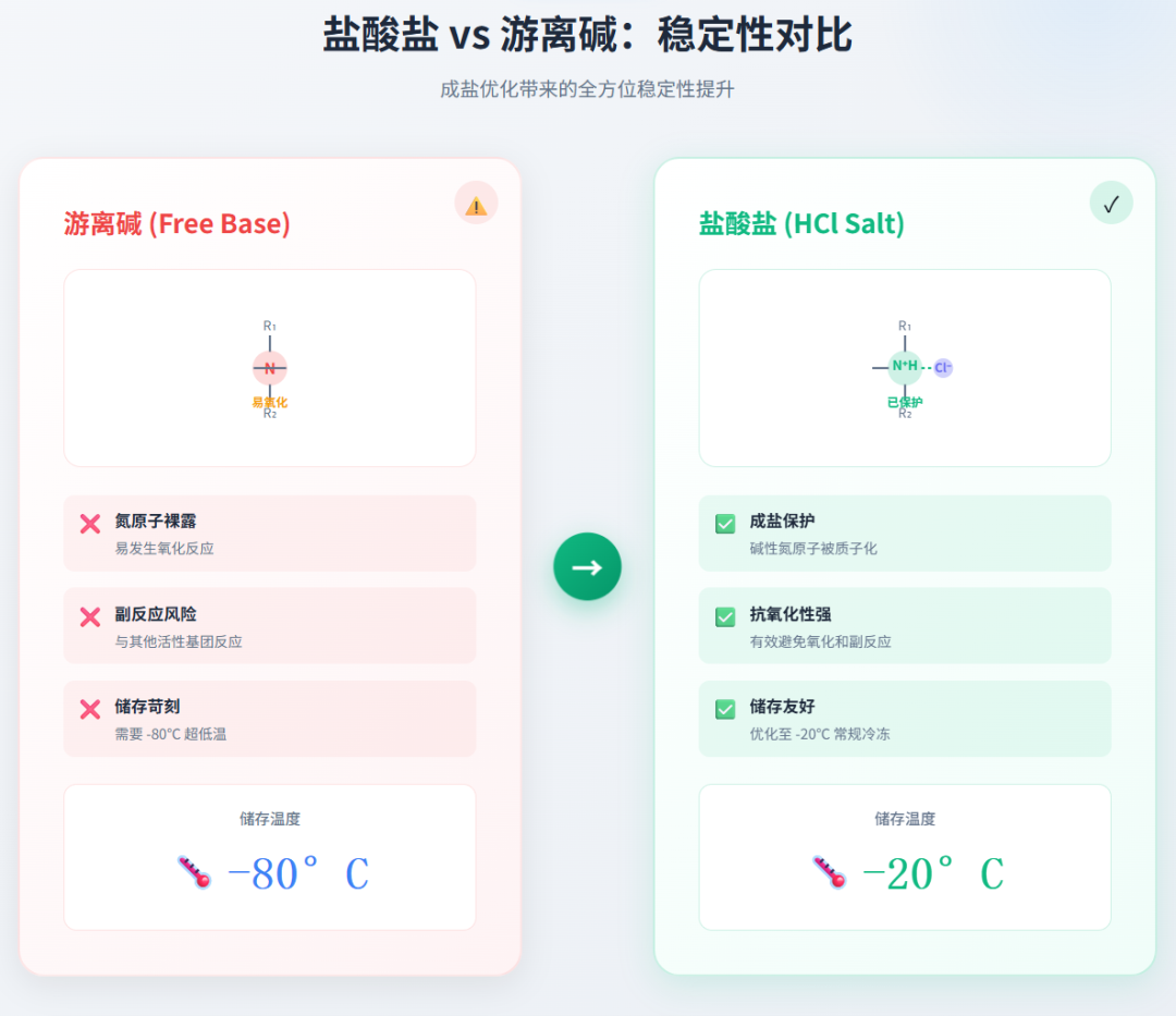 1.盐酸盐形式:显著提升的稳定性 从化学结构上看,盐酸盐通过与碱性氮原子成盐,有效避免了游离胺的氧化或与其他活性基团的副反应,从而获得了比游离碱(Free Base)更优越的化学稳定性。 这直接转化为更长的产品货架期和更可靠的实验数据一致性。同时,其物理稳定性也得到改善,储存条件由-80℃优化至-20℃。 更稳定 = 更可控 = 更少返工与重复验证成本。
