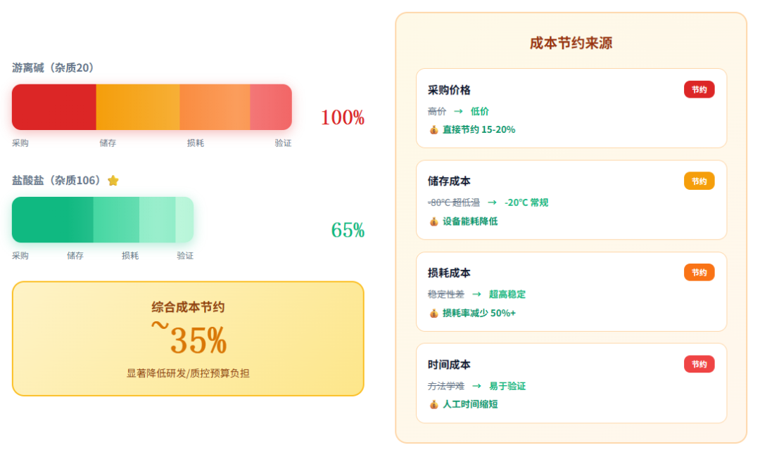 我们理解很多客户之前选择游离碱(杂质20),更多是因为“先用熟悉的”。但在当前研发节奏与成本压力下,用更稳定、更高纯度的盐酸盐新品,获得更好的综合成本表现,能显著降低对照品采购与损耗带来的负担。 此外,得益于成熟的成盐工艺和规模化生产,乌拉地尔杂质106的生产成本得到了有效控制,使其价格低于此前的游离碱产品,极大地节约了您的研发或质控预算。